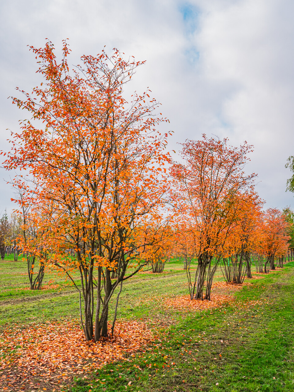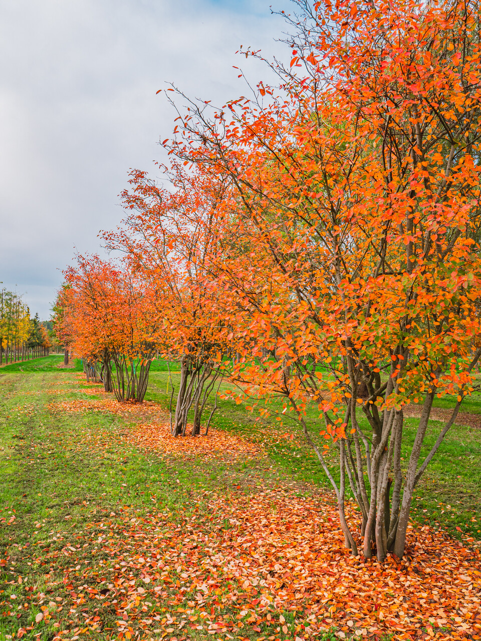 De bladeren van de Amelanchier lamarckii kleuren in de herfst geel, rood.