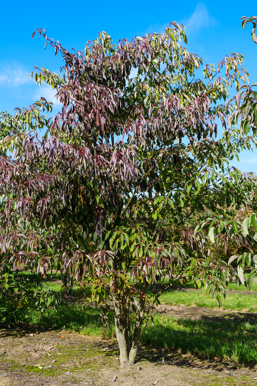 De bladeren van de Cornus controversa kleuren in de herfst rood, purper.