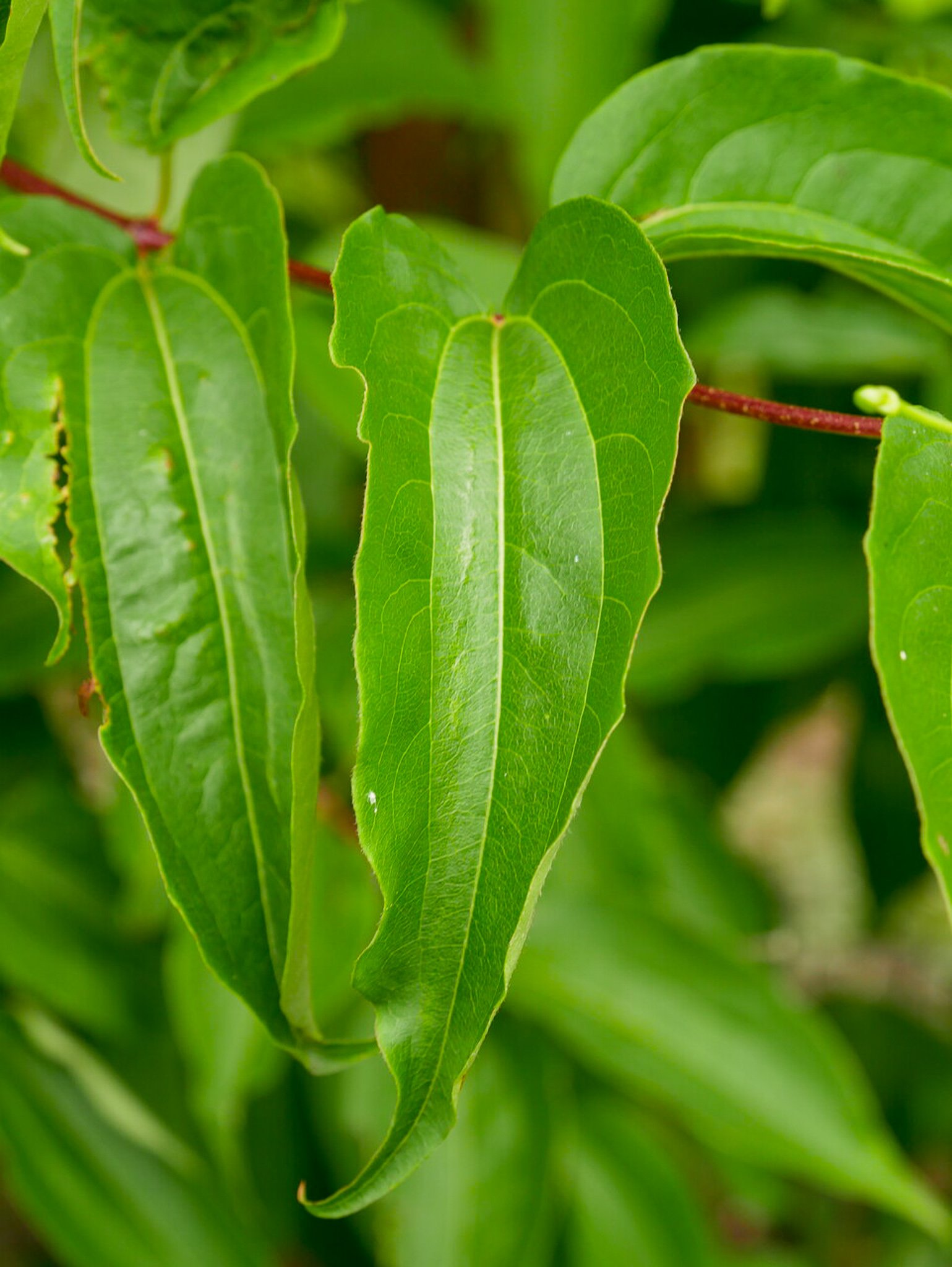 tegenoverstaand, langwerpig-eirond, met drie hoofdnerven, donkergroen, 8 - 16 cm
