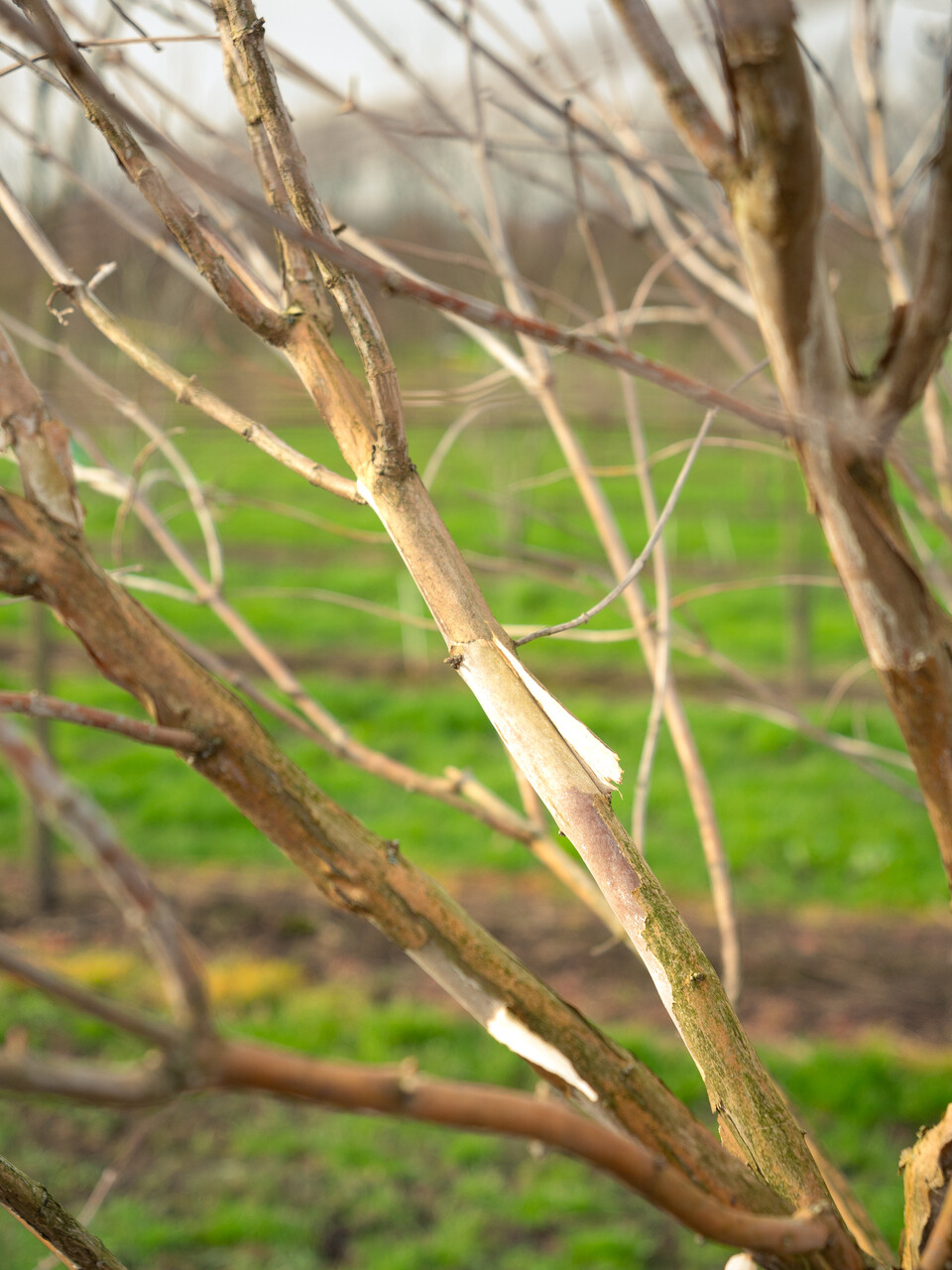 twijgen licht grijsgroen, bast geelbruin tot bruin, afschilferend