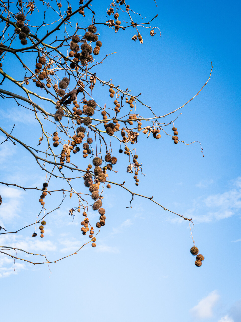 Platanus orientalis 'Minaret' bloeit in mei, juni.