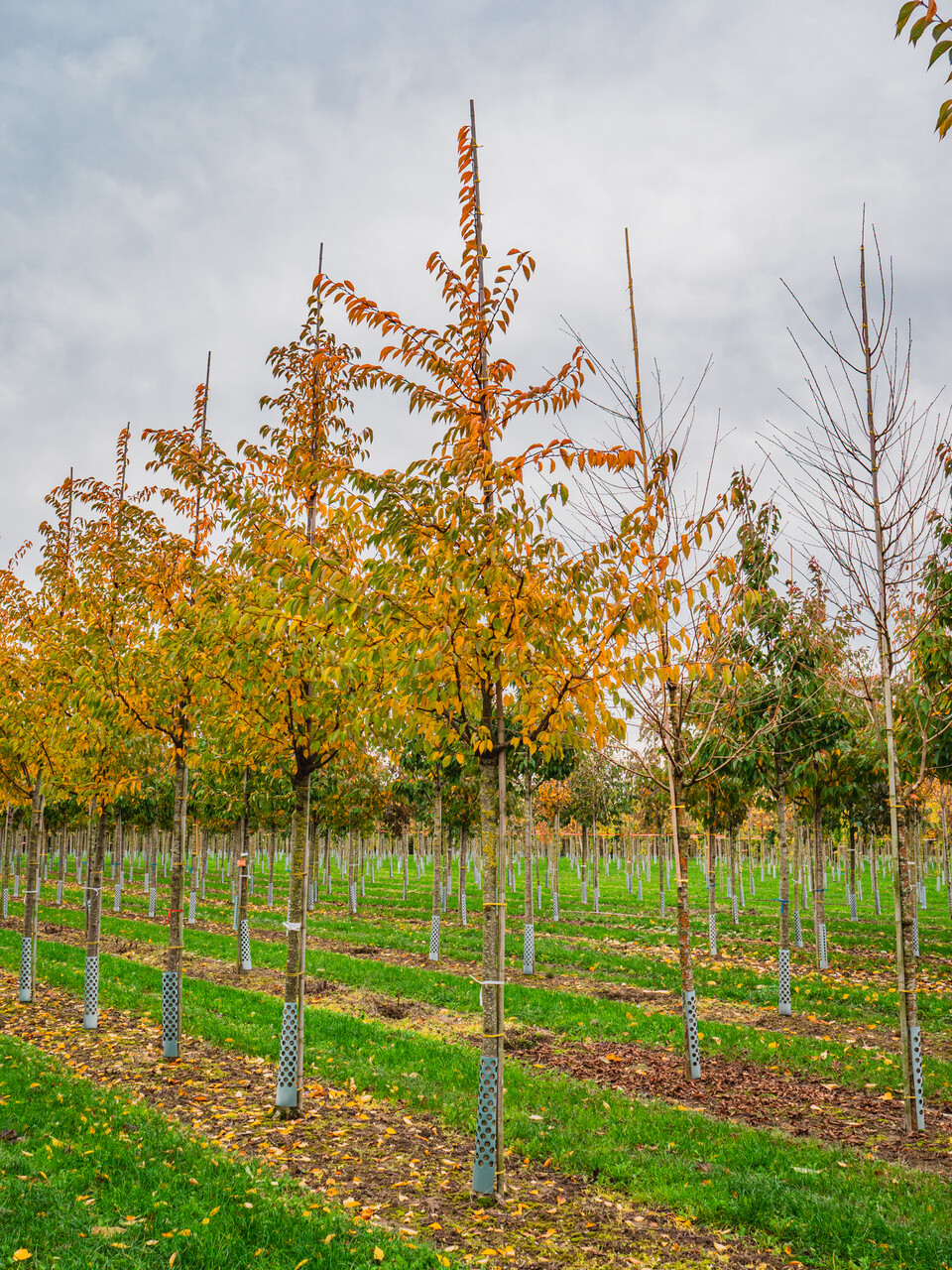 De bladeren van de Prunus 'Accolade' kleuren in de herfst geel, oranje, rood.