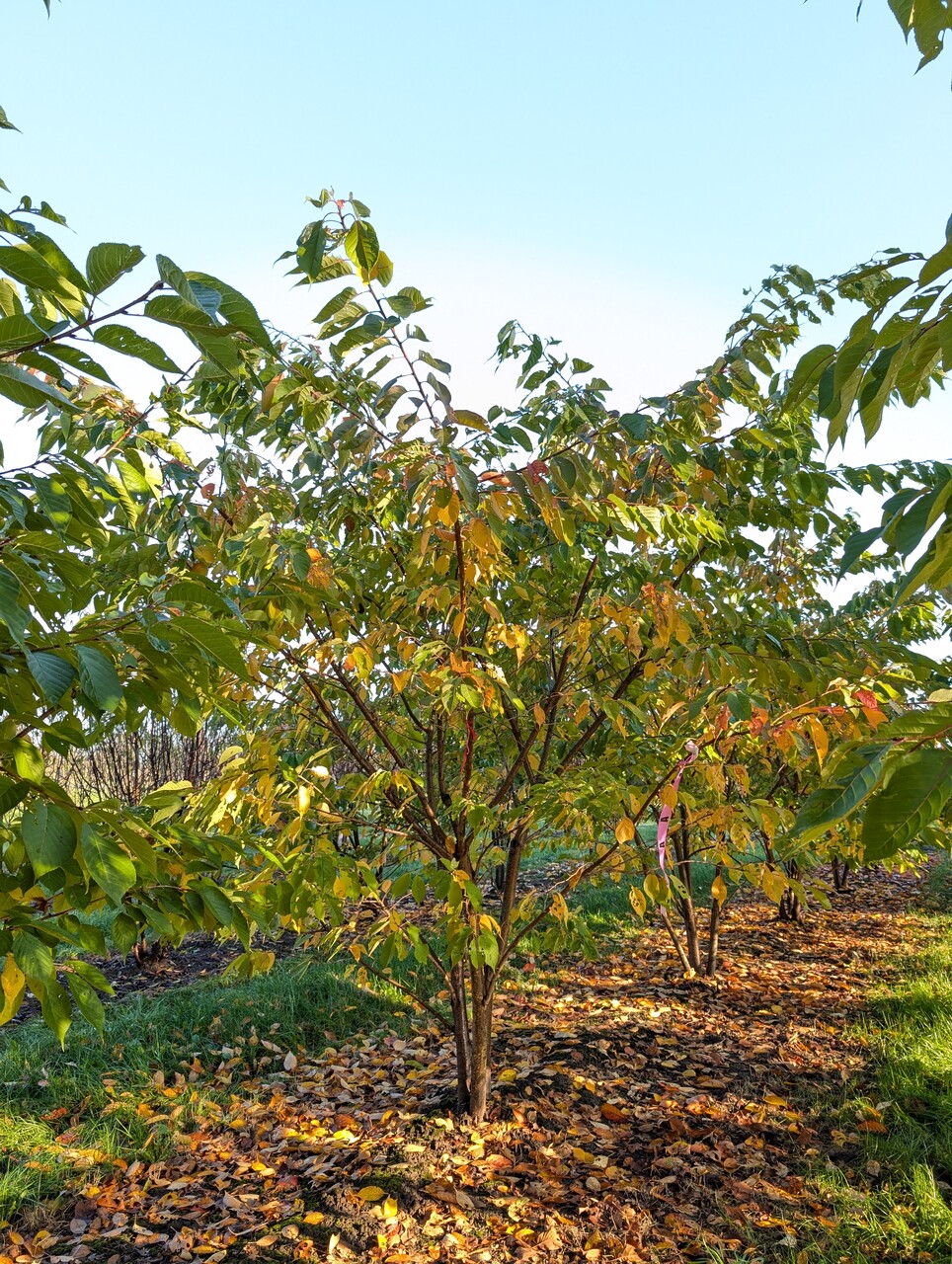 De bladeren van de Prunus serrulata 'Kanzan' kleuren in de herfst geel, oranje.