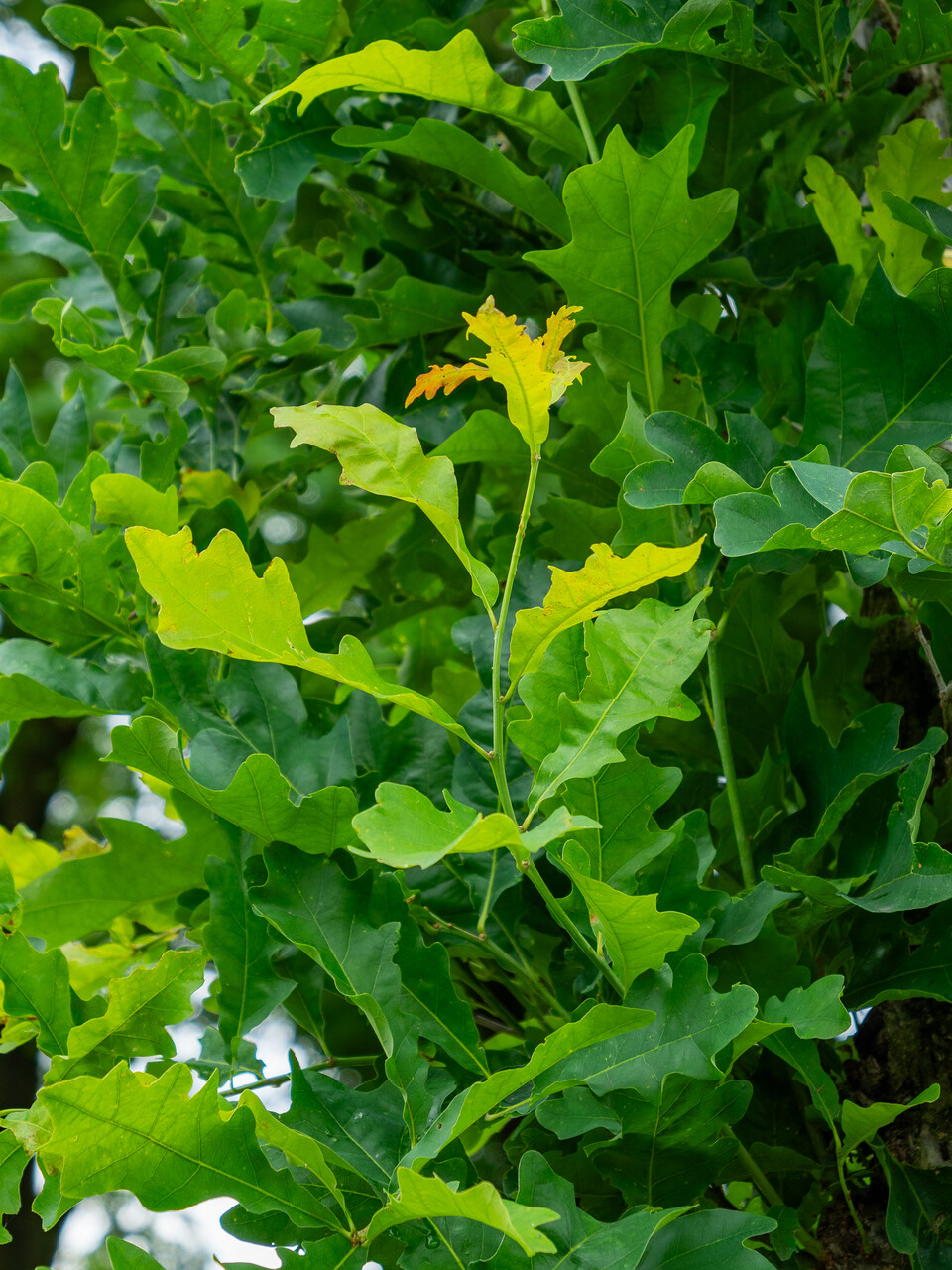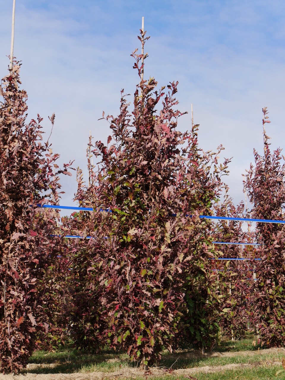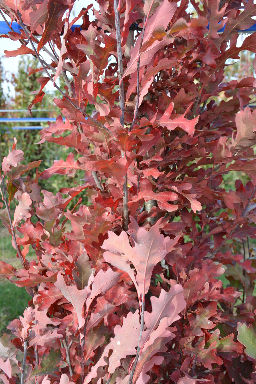 Zuilvormige eik die op latere leeftijd, vooral onderin de boom, wat breder wordt en dan een smal ovale kroon krijgt. Uiteindelijk zal de boom circa 15 m hoog worden bij een breedte van circa 5 m. Ontstond uit een kruising tussen Q. alba en Q. robur 'Fastigiata'. Qua uiterlijk heeft de boom de meeste kenmerken van Q. robur 'Fastigiata'. De lichtbruine bast is gegroefd. De bladeren zijn ondiep gelobd en donkergroen. De onderzijde is slechts in de nerfoksels behaard. In de herfst kleurt het rood tot purperrood, een eigenschap die de boom van Q. alba heeft meegekregen. Ook de hoge resistentie tegen meeldauw komt van de Amerikaanse ouder. De combinatie van een smalle kroon, gezond blad en een fraaie herfstkleur maakt 'Crimschmidt' een breed toepasbare laan- en straatboom. Werd door J. Frank Schmidt & Son, Boring, Oregon, Verenigde Staten, op de markt gebracht.
