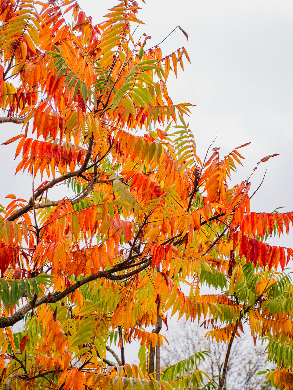 De bladeren van de Rhus typhina kleuren in de herfst geel, oranje, rood.