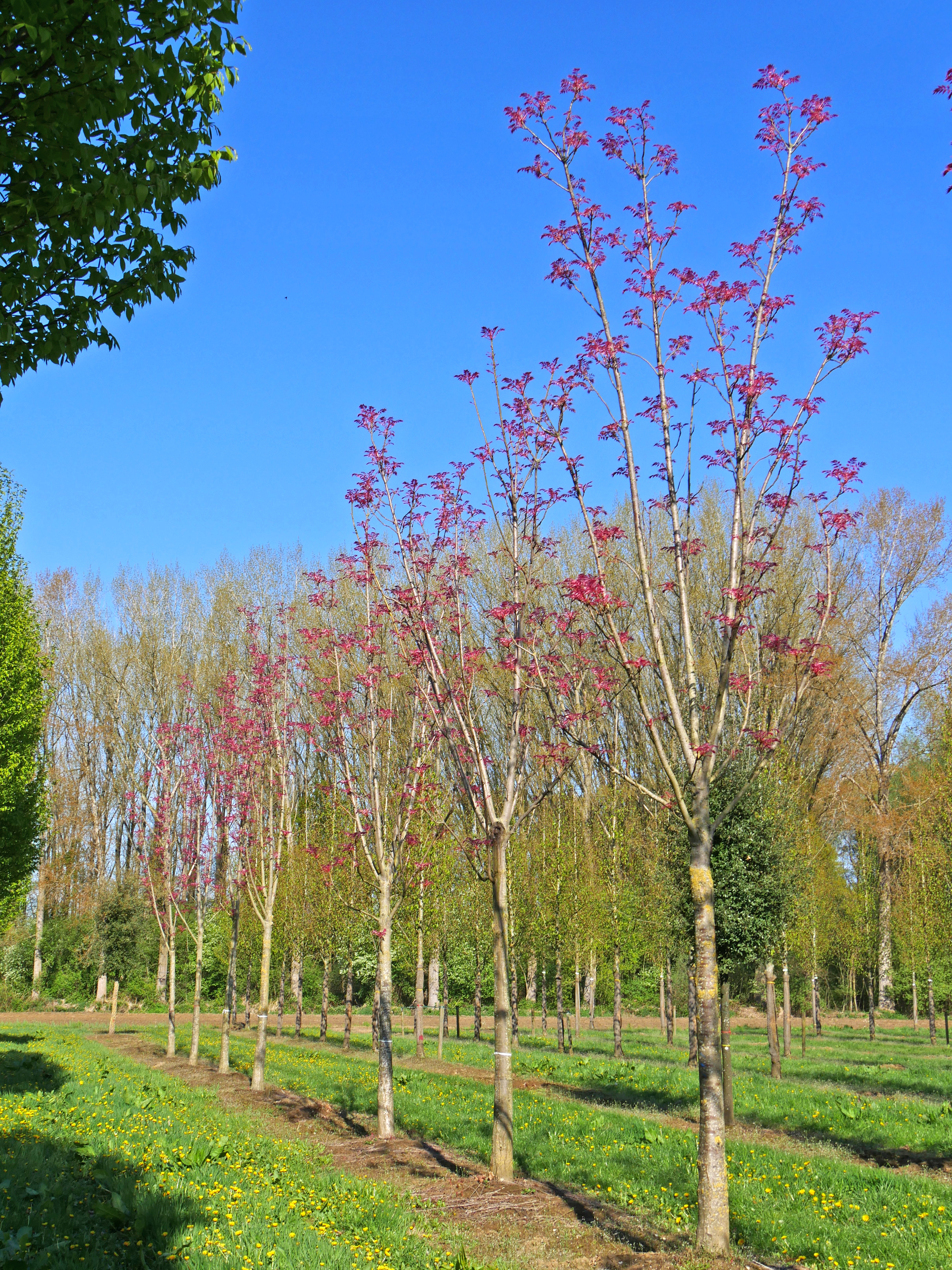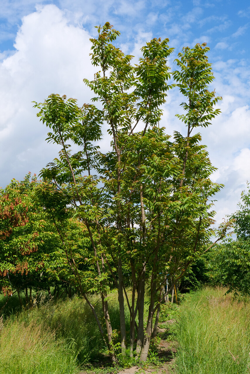 Bijzonder opvallende middelgrote boom, met een hoogte van 10 tot 15 m. Aanvankelijk groeit de boom slank omhoog en heeft deze een zuilvormige kroon. Later wordt de kroon breder. De jonge twijgen zijn koperkleurig en behaard. De oude bast is bruingrijs, later met lengtespleten. Bij beschadigen geuren bast, takken en bladeren onaangenaam. Het grote, even geveerde blad, bestaat uit 20 tot 26 deelblaadjes. Deze hebben dezelfde vorm als bij de soort. Bij uitlopen zijn ze intens oranjeroze om via groengeel uiteindelijk glanzend lichtgroen te kleuren. In de herfst kleurt het blad geel. De kleine, eveneens onaangenaam geurende bloemen verschijnen in grote pluimen. Na de bloei vormen zich houtige doosvruchten met daarin gevleugelde zaden. De bloemen en vruchten verschijnen alleen bij warme zomers. Een bijzondere parkboom of solitair.