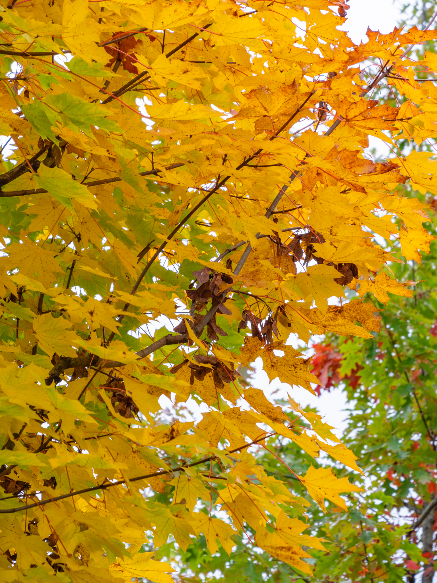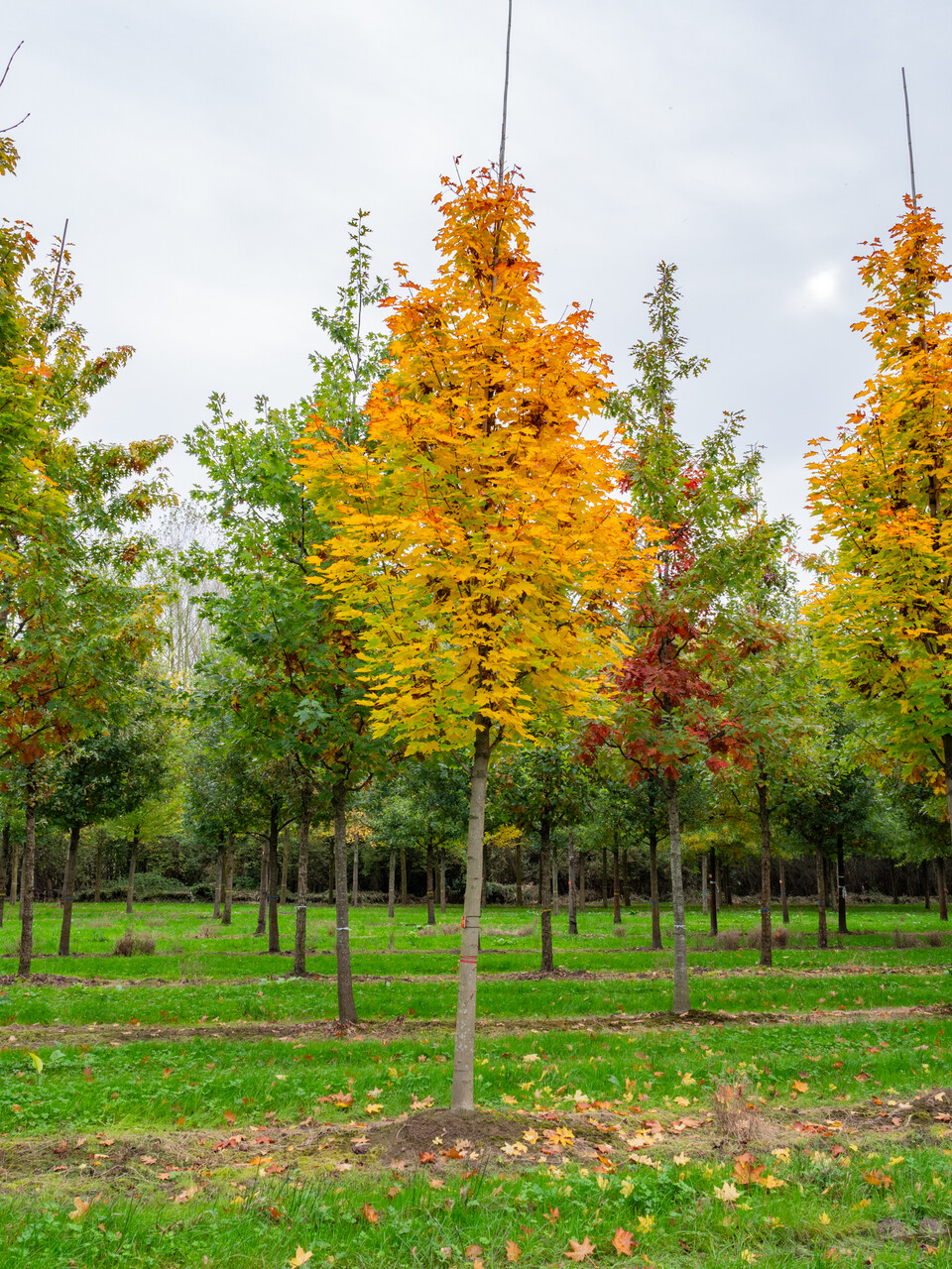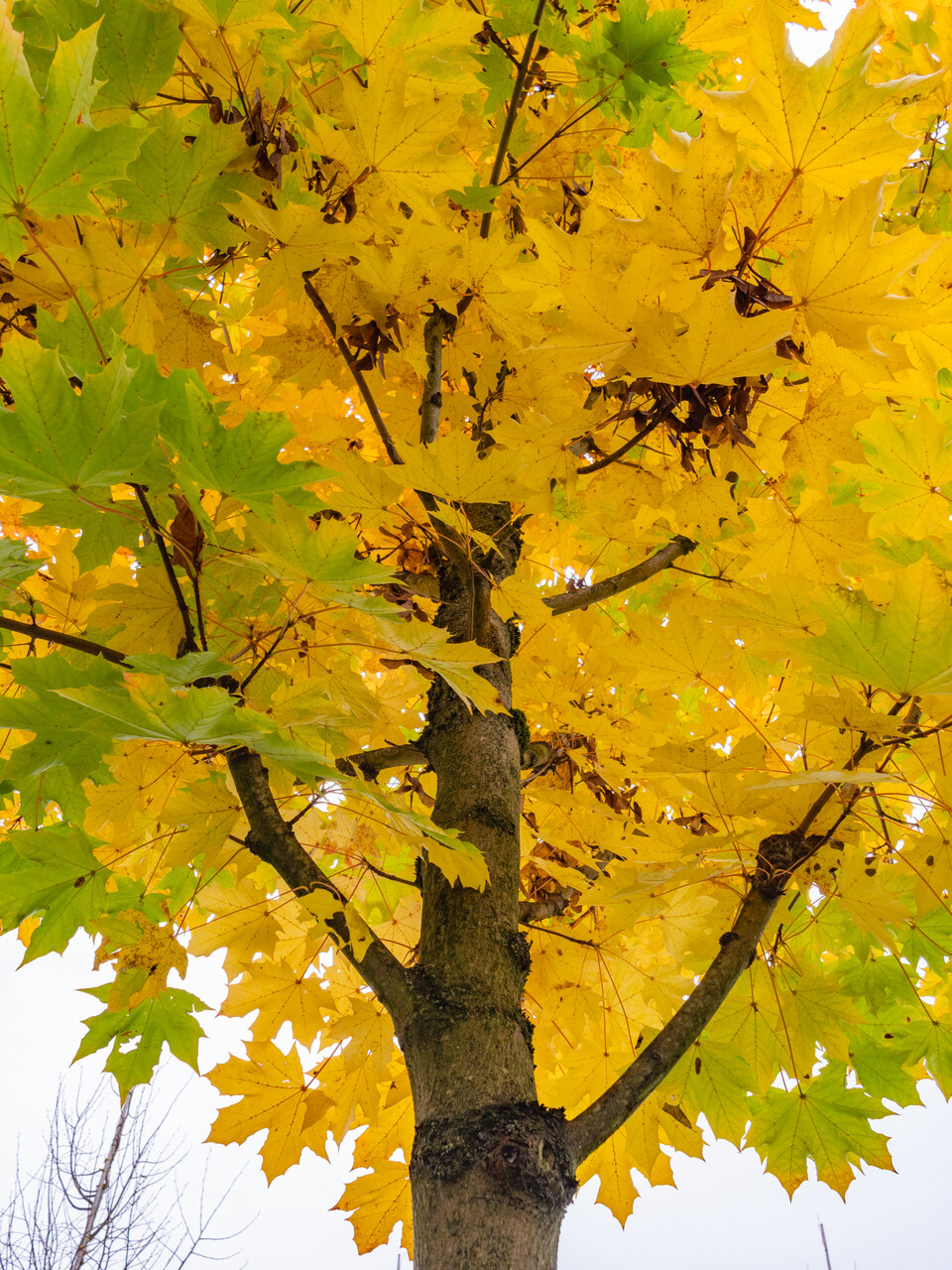 De bladeren van de Acer platanoides 'Columnare' kleuren in de herfst geel.