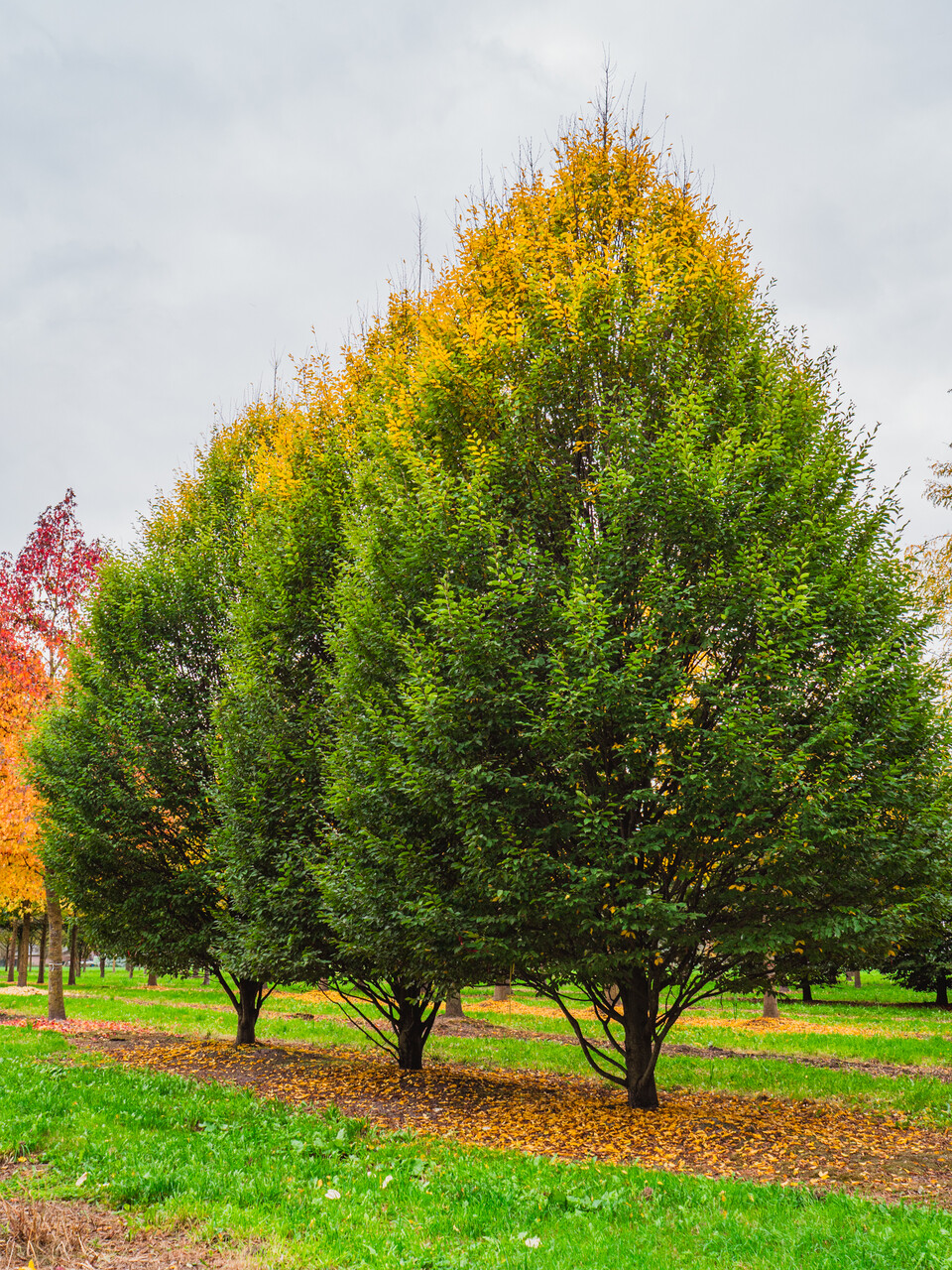 De bladeren van de Carpinus betulus 'Fastigiata' kleuren in de herfst geel.