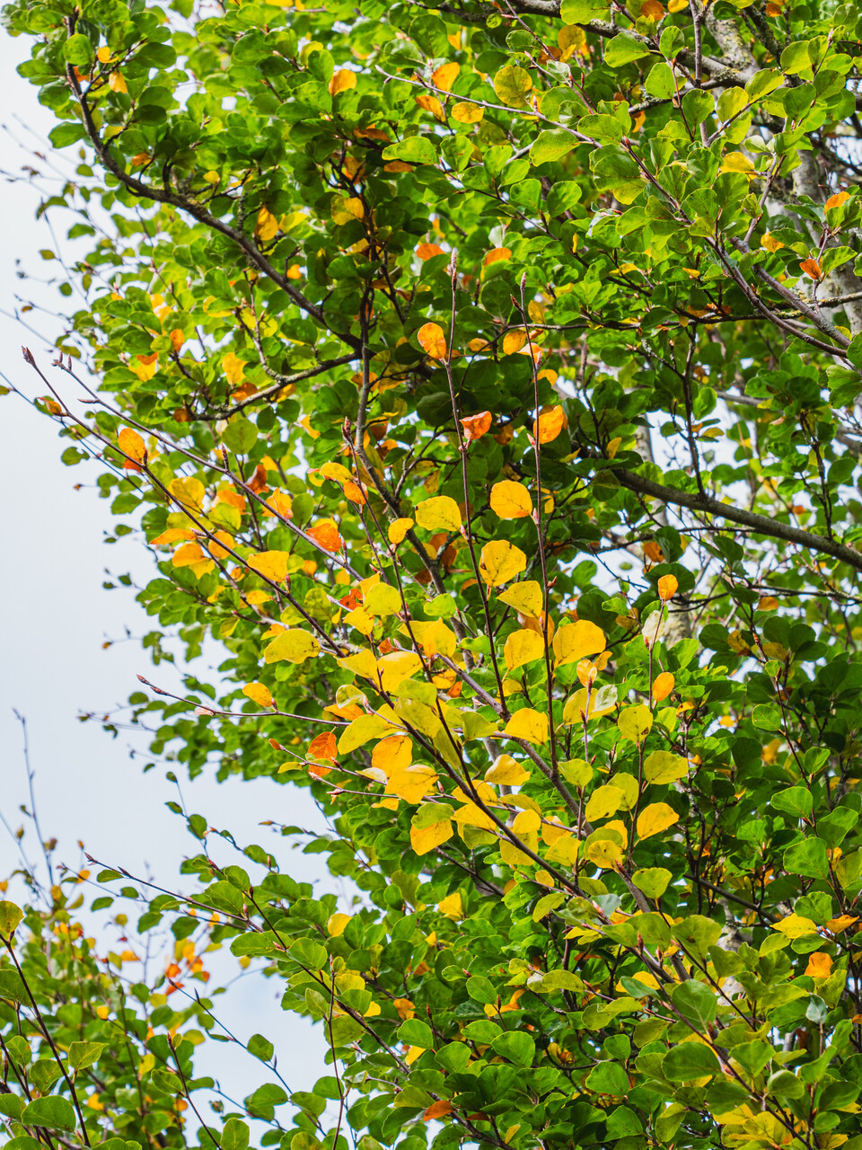 De bladeren van de Fagus sylvatica 'Rotundifolia' kleuren in de herfst geel.