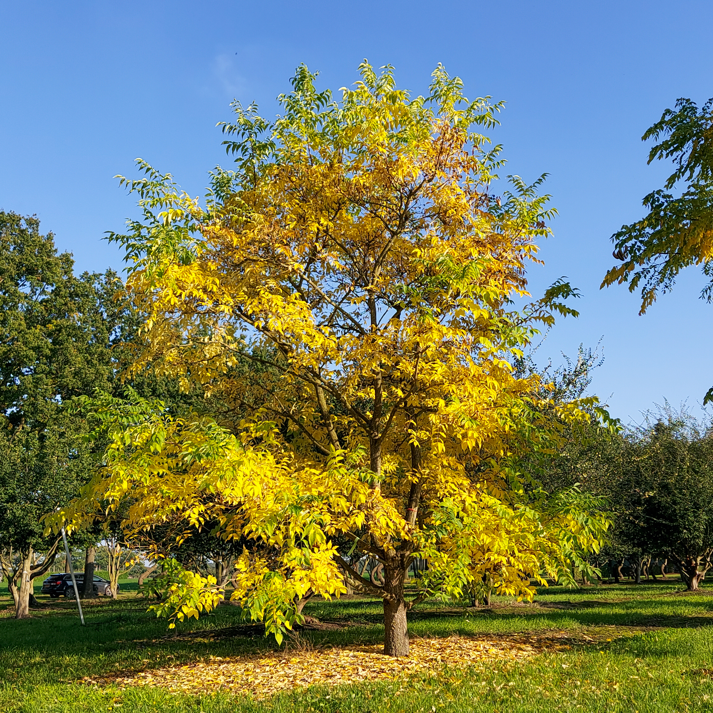 De bladeren van de Gymnocladus dioica kleuren in de herfst geel.