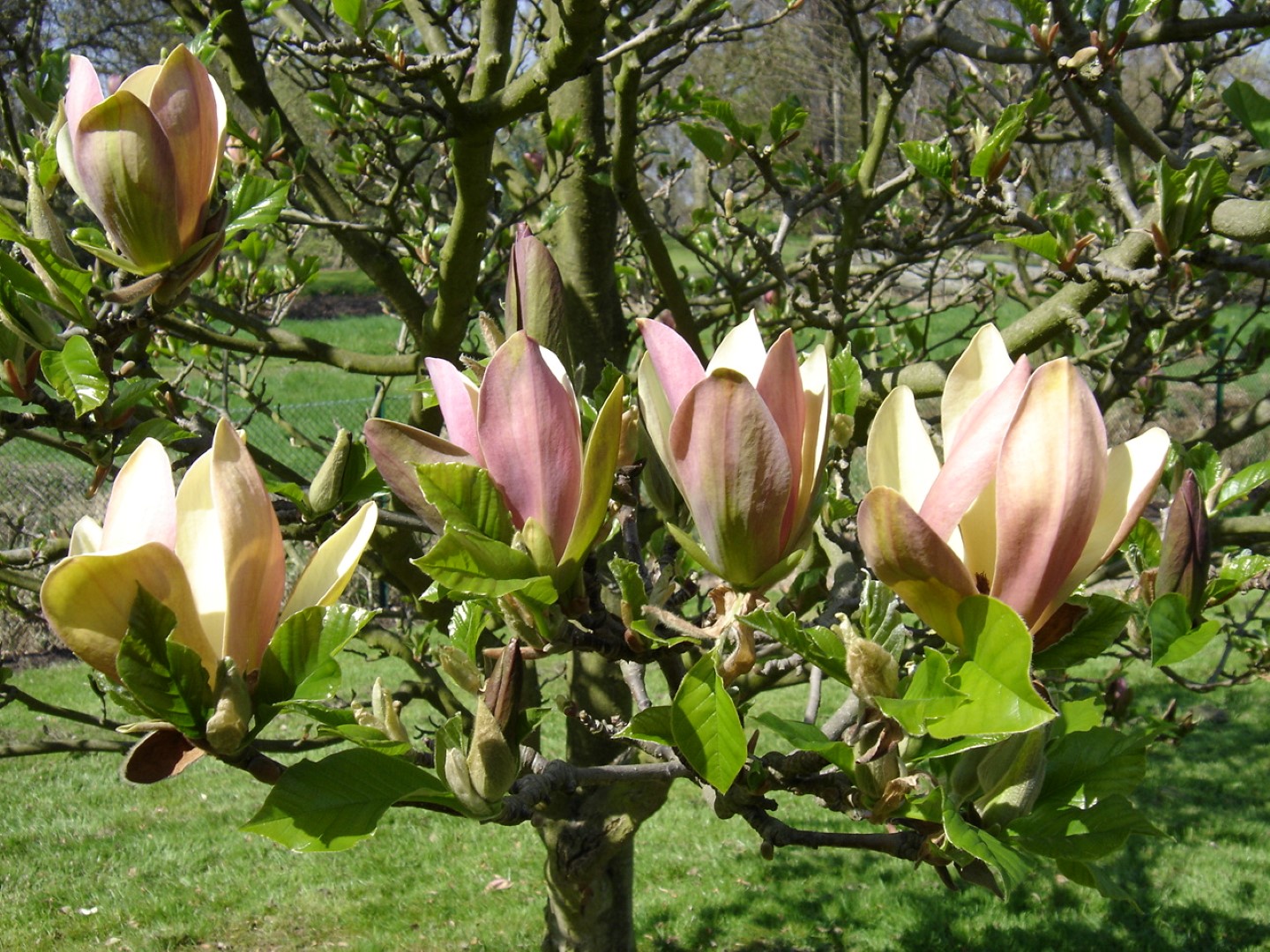 Magnolia ×brooklynensis 'Woodsman' bloeit in april.