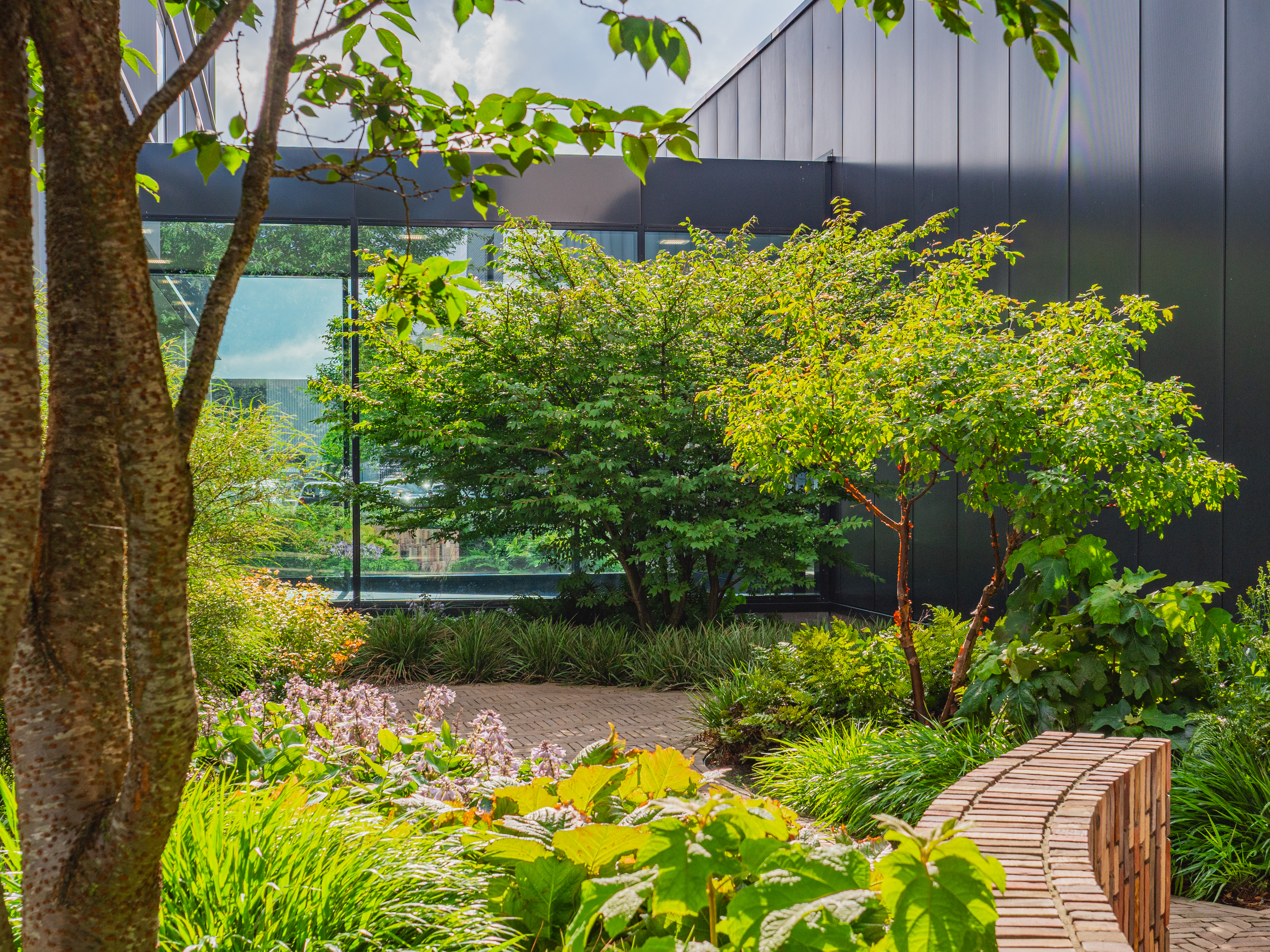 In het voorjaar kleurt Prunus 'Accolade' het terrein roze, volle, halfgevulde bloemen op nog kale takken, nog voor het blad uitloopt. De Amelanchier lamarckii bloeit op hetzelfde moment in wit en kleurt in de herfst oranje-rood. Acer griseum valt op door zijn dunne, afbladderende kaneelbruine schors en helder rood herfstblad. De Zelkova carpinifolia 'Verschaffeltii' groeit uit tot een brede vaas met fijn getand blad, robuust en weinig veeleisend. En de Pinus sylvestris geeft het geheel structuur in de winter, wanneer de rest van het sortiment kaal staat.
